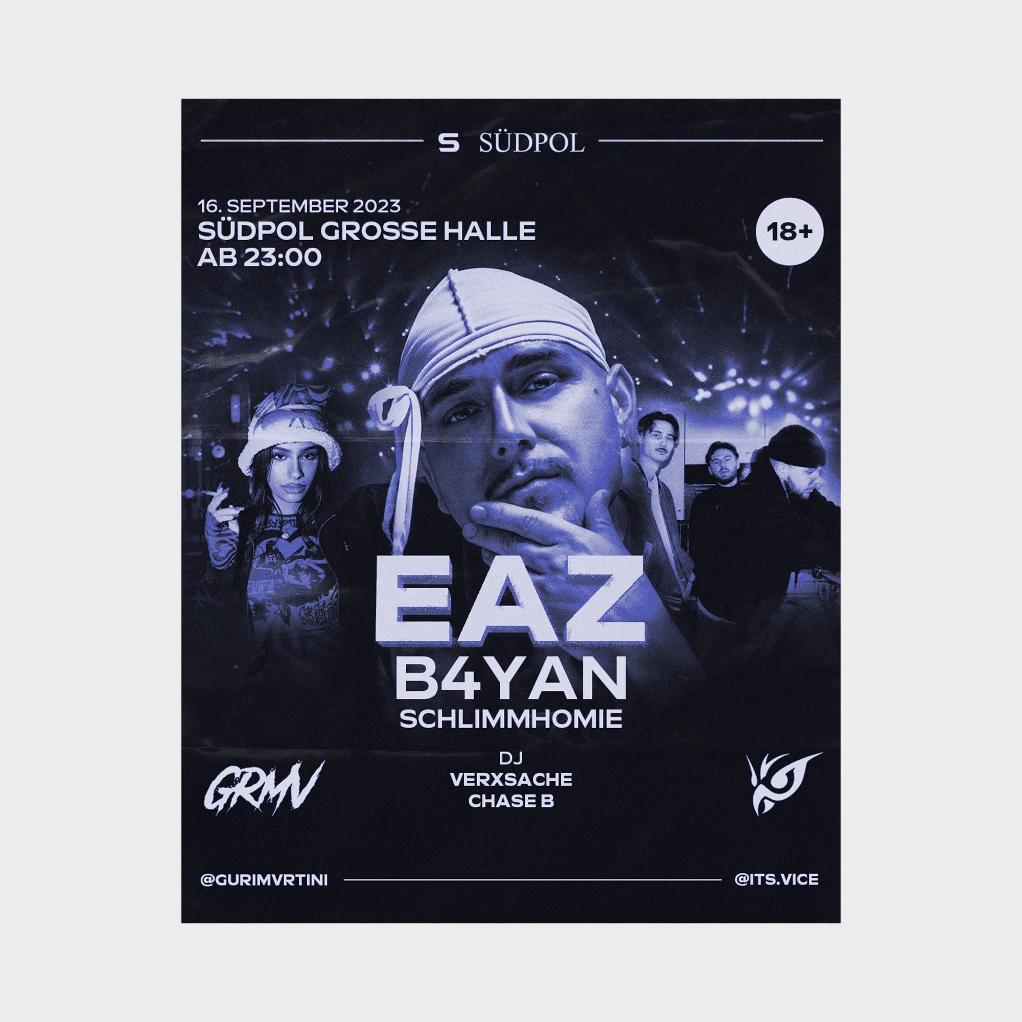 For an EAZ concert hosted by Südpol Luzern in collaboration with VICE, I designed the promotional banner for the event, featuring performances by EAZ, B4YAN, and Schlimmhomie. In addition to the static banner, I created an animated reel version for use on social media. The goal was to produce a strong, attention-grabbing visual that works within a cultural and music-driven context while remaining clear and readable across digital and physical placements. The design balances the presence of the artists with the character of the venue and the collaborating partners, while the animated version adds movement and reach for online promotion. Both assets were used as part of the official event promotion, supporting visibility and communication around the concert.