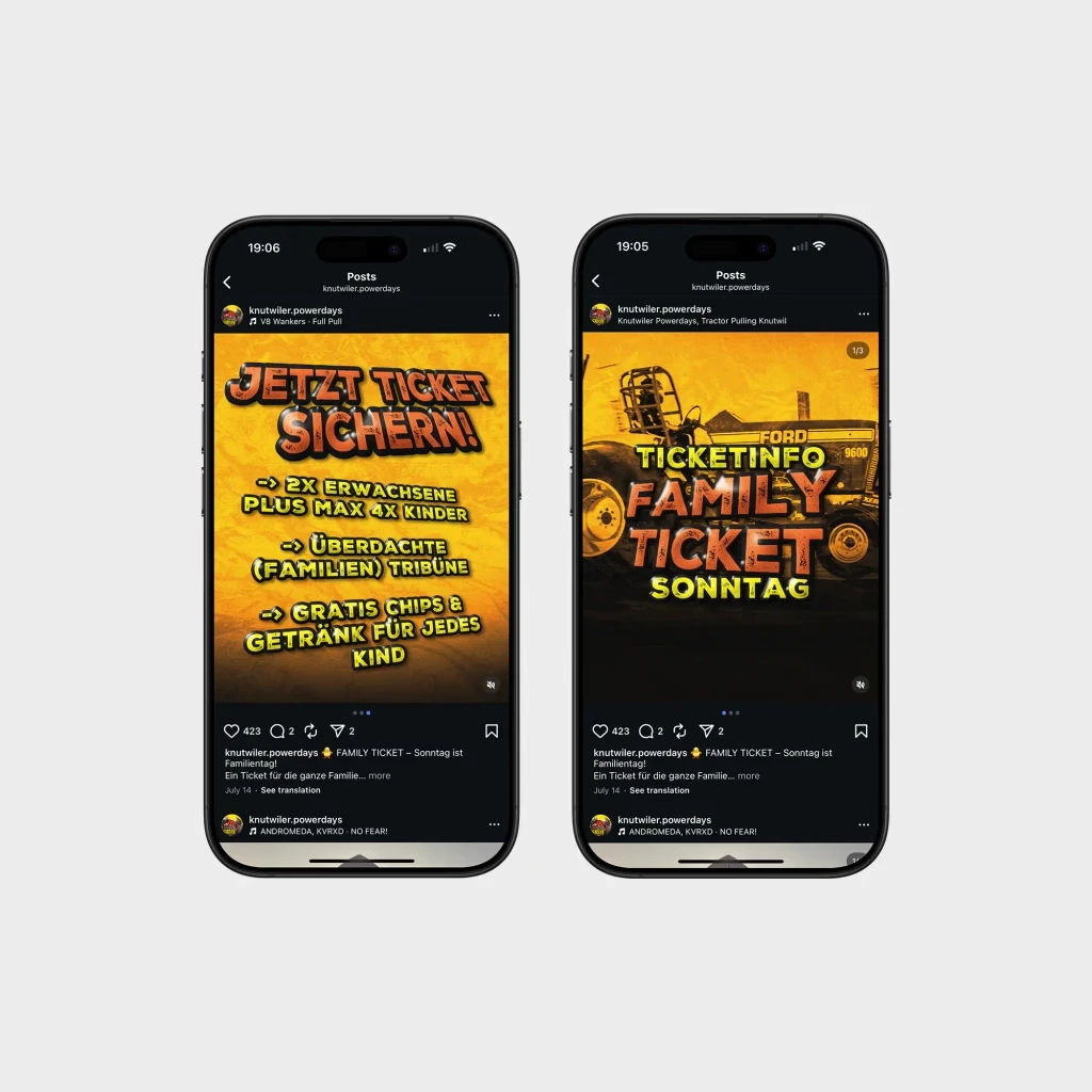 For Knutwiler Powerdays, I worked together with a creative partner to build and execute the event’s marketing and social media presence. The goal was to strengthen the digital visibility of the festival, reach new audiences, and actively support ticket sales. We produced video and social media content around the event itself. While the filming was done collaboratively and the editing was handled by my partner, my main responsibility was the strategic and editorial side. I developed the content plan, created organic image posts, and designed informational content such as ticket announcements, program highlights, and general festival updates. In addition, I managed the social media advertising and planned paid campaigns focused on reach and conversion. By combining organic content with paid ads, the project opened new digital channels for the event, significantly increased visibility, and contributed to record-breaking ticket sales. Over the course of the collaboration, the social media follower base was nearly doubled.